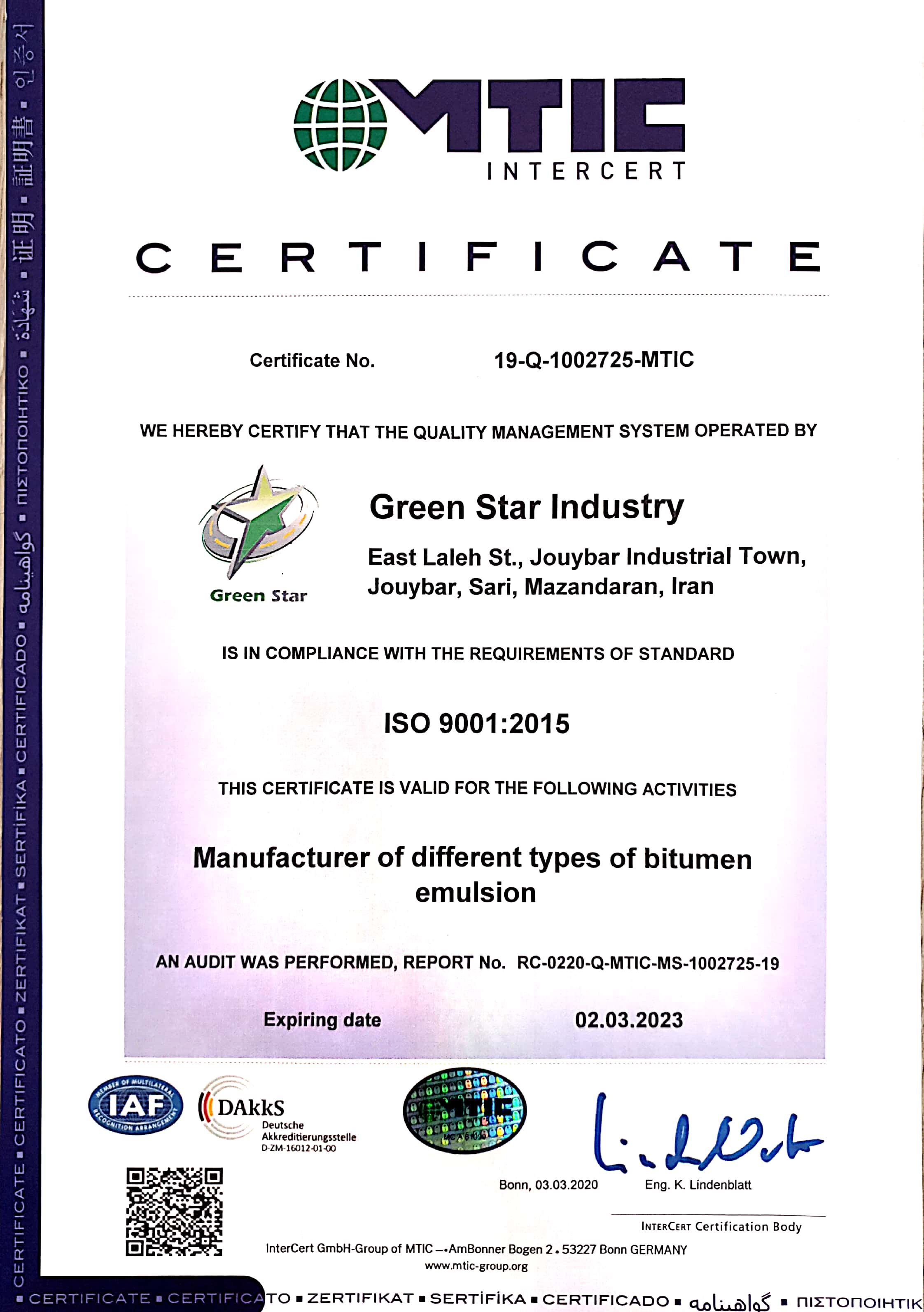 شرکت ستاره سبز، با در اختیار داشتن متخصصین مجرب و با رعایت اصول فنی و کیفی در تمام امور مجموعه در تمامی قسمتها، اعم از بازاریابی، ثبت سفارش، تولید انواع قیر امولسیون و قیر محلول (MC) مورد نیاز مشتریان داخلی و خارجی، انتقال و پخش محصول و تحویل آن به مشتری و ارائه مشاوره به مشتریان قبل و پس از خرید، ارزیابی مستمر کیفیت در تمامی مراحل تولید، حمل و اجرای محصولات، در سال 1397 موفق به اخذ گواهینامه فنی مرکز تحقیقات وزارت راه و شهرسازی ایران شد.