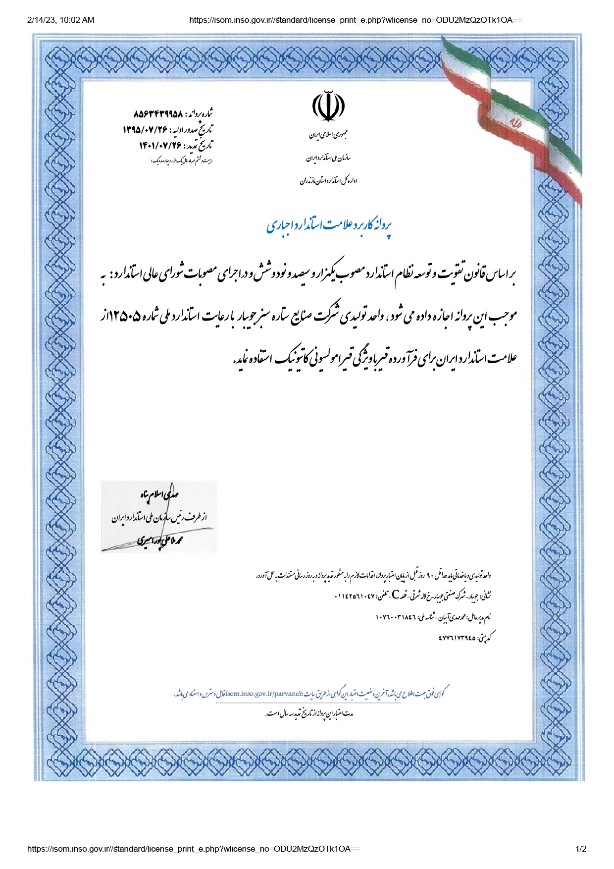 شرکت ستاره سبز با به کاربستن کلیه موارد استاندارد مدیریتی ایزو 9001، برای سالیان پیاپی موفق به اخذ گواهینامه ایزو 9001 از توف آلمان شده است. رعایت استانداردهای جهانی ایزو 9001 شرکت توف، باعث نظم بخشی به کلیه قسمتهای تولیدی، صنعتی و تجاری و در هم تنیدن ارتباطات تنگاتنگ میان این قسمتهای مجموعه است.